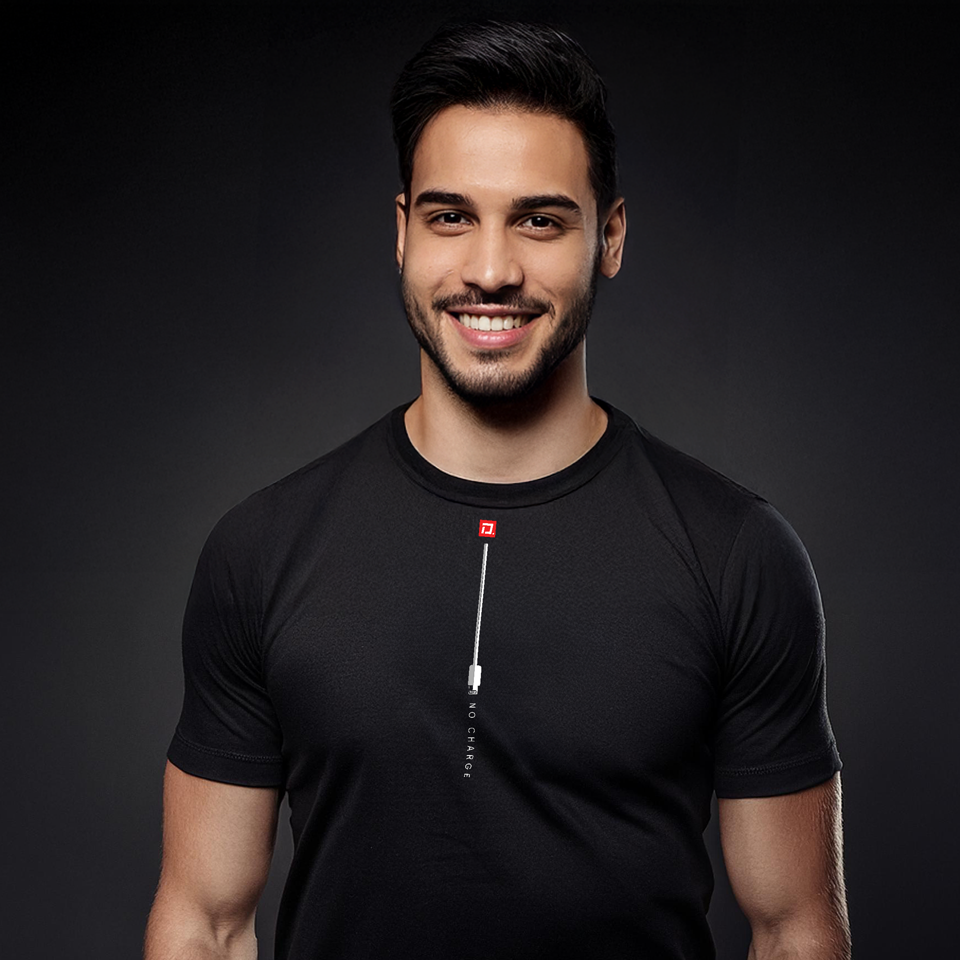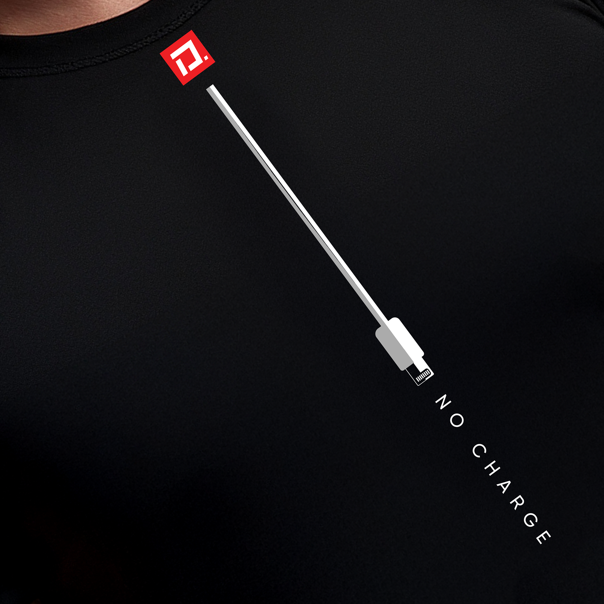 Apple charge cable design. Simple black, 100% cotton, short sleeve, crew neck, New York style. Featuring original graphic art by Zevon — US$28 (SM • M • L • XL • 2XL) Also available in Women's fitted Tees (US$28)